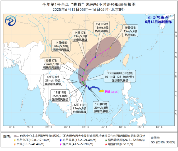 受其影响,预计6月12日至14日,华南大部将有大到暴雨,局地大暴雨或特大暴雨。其中,6月12日08时至13日08时,广东北部和中西部沿海、海南岛大部、台湾岛有大雨或暴雨,其中,海南岛东南部和台湾岛东南部的部分地区有大暴雨(100-150毫米);南海大部、北部湾、琼州海峡、西沙群岛、南沙群岛、中沙群岛、广东沿海、海南岛沿海、广西沿海将有6-8级风,阵风9-10级,台风中心经过的附近海域风力可达9-11级,阵风12-13级。