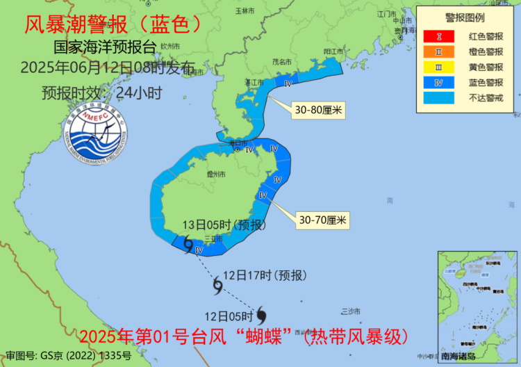 自然资源部透露,受今年第1号台风“蝴蝶”影响,6月12日中午到13日中午,南海西部将出现巨浪到狂浪区,海南东部、南部近岸海域将有大浪到巨浪,海浪警报升级为橙色 ;同时,广东省、海南省的风暴潮预警级别维持为蓝色。